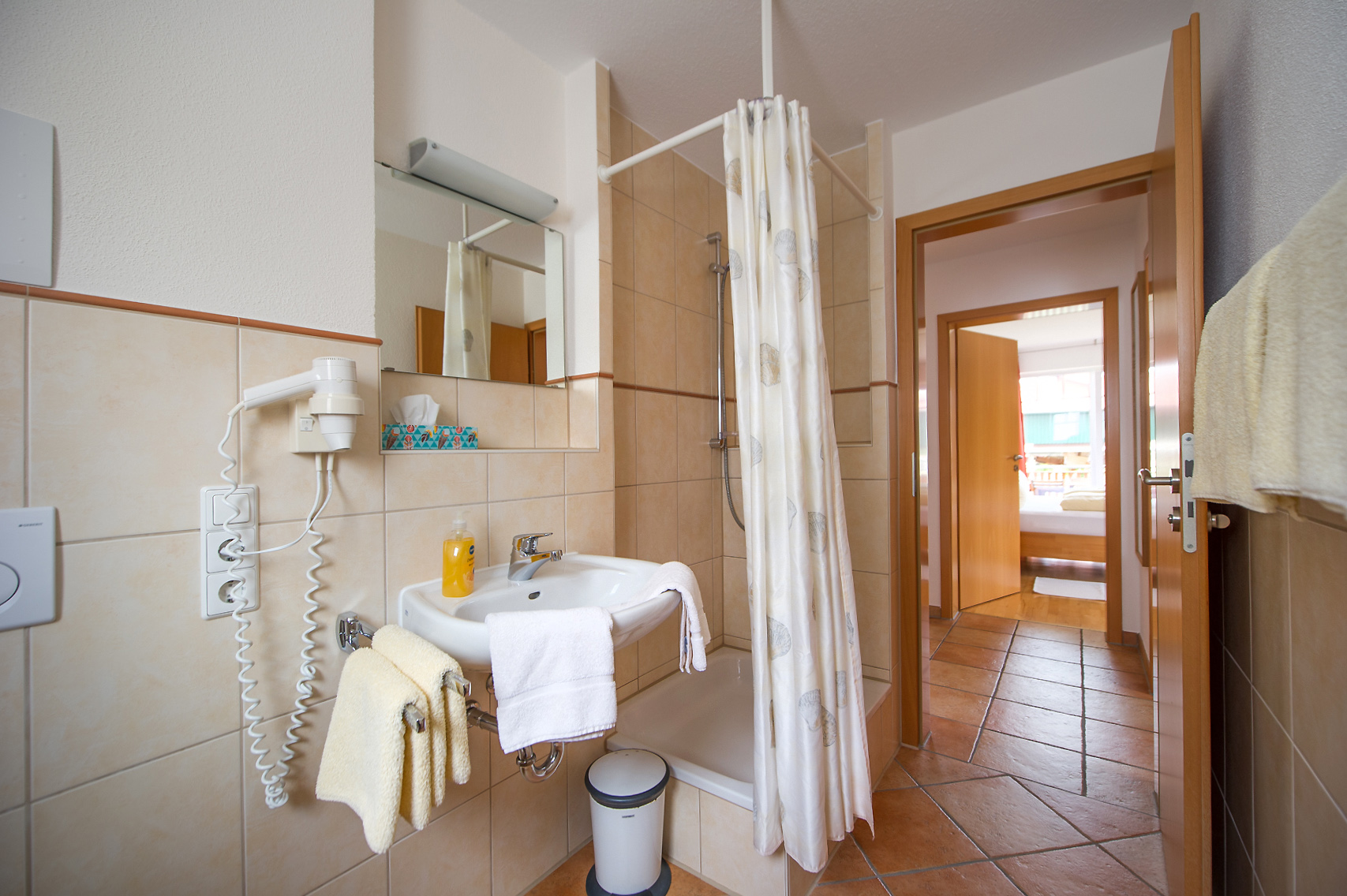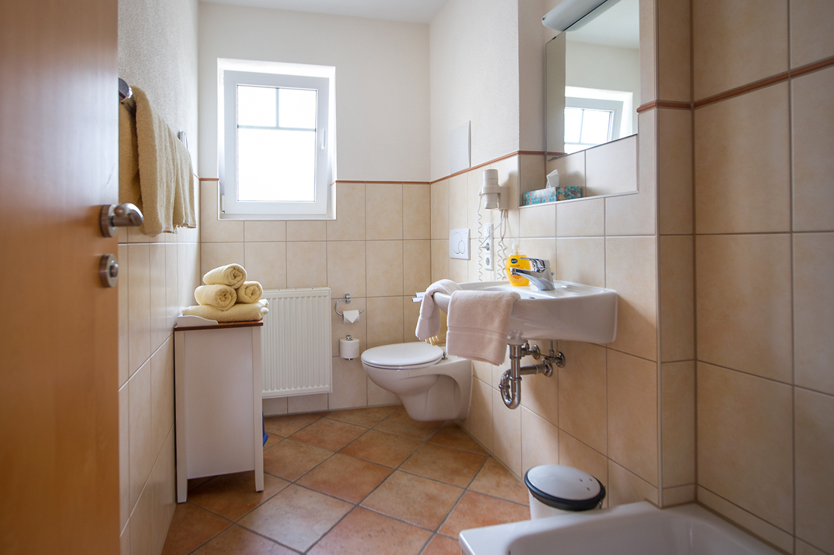 1 Badezimmer mit Dusche, WC, Föhn und Schminkspiegel