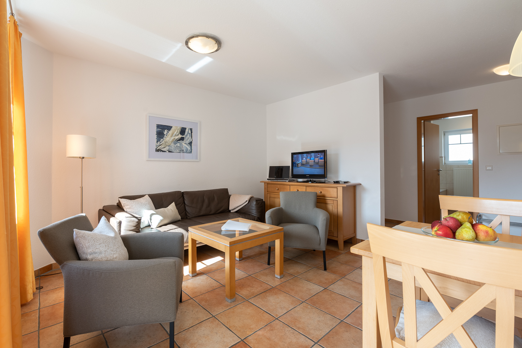 Großzügiger Wohn- und Essbereich ausgestattet mit: Sofa, Sessel, Esstisch, Sat-TV, DVD- Spieler, Ministereoanlage